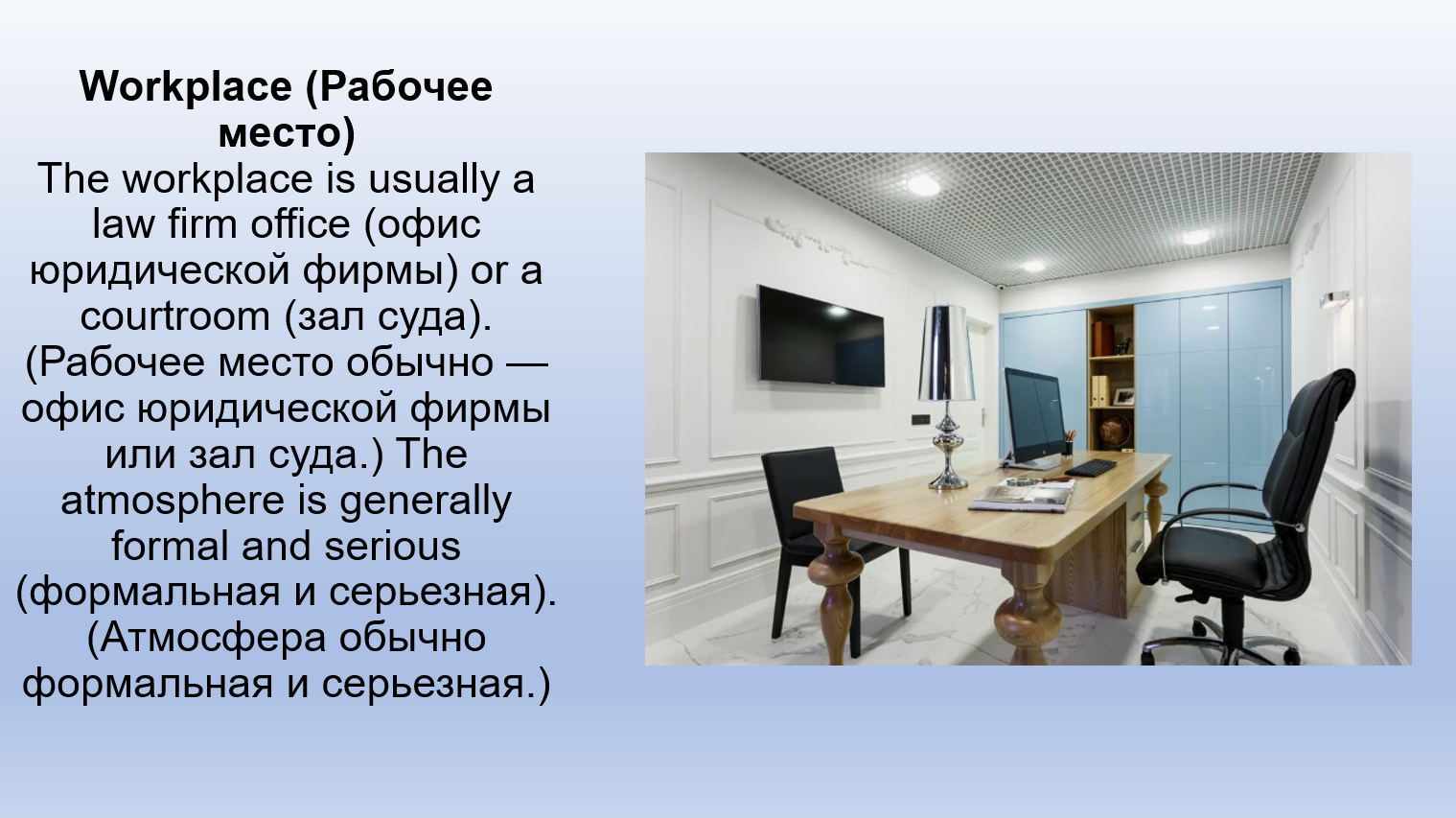A lawyer uses PCs (ПК) for research, law books and legal documents (книги по праву и юридические документы), and a mobile phone for communication. (Юрист использует ПК для исследований, книги по праву и юридические документы и мобильный телефон для связи.)