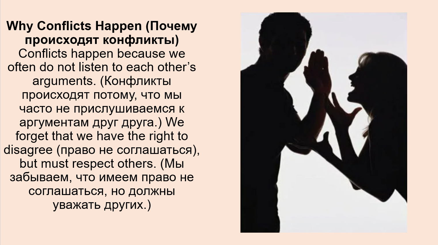 - Agree. (Согласен.) The text says that people often have conflicts because they do not hear what the other person is saying (не слышат, что говорит другой человек).