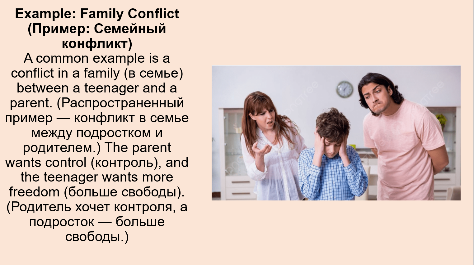 It was a conflict between a child and the parents. (Это был конфликт между ребенком и родителями.)