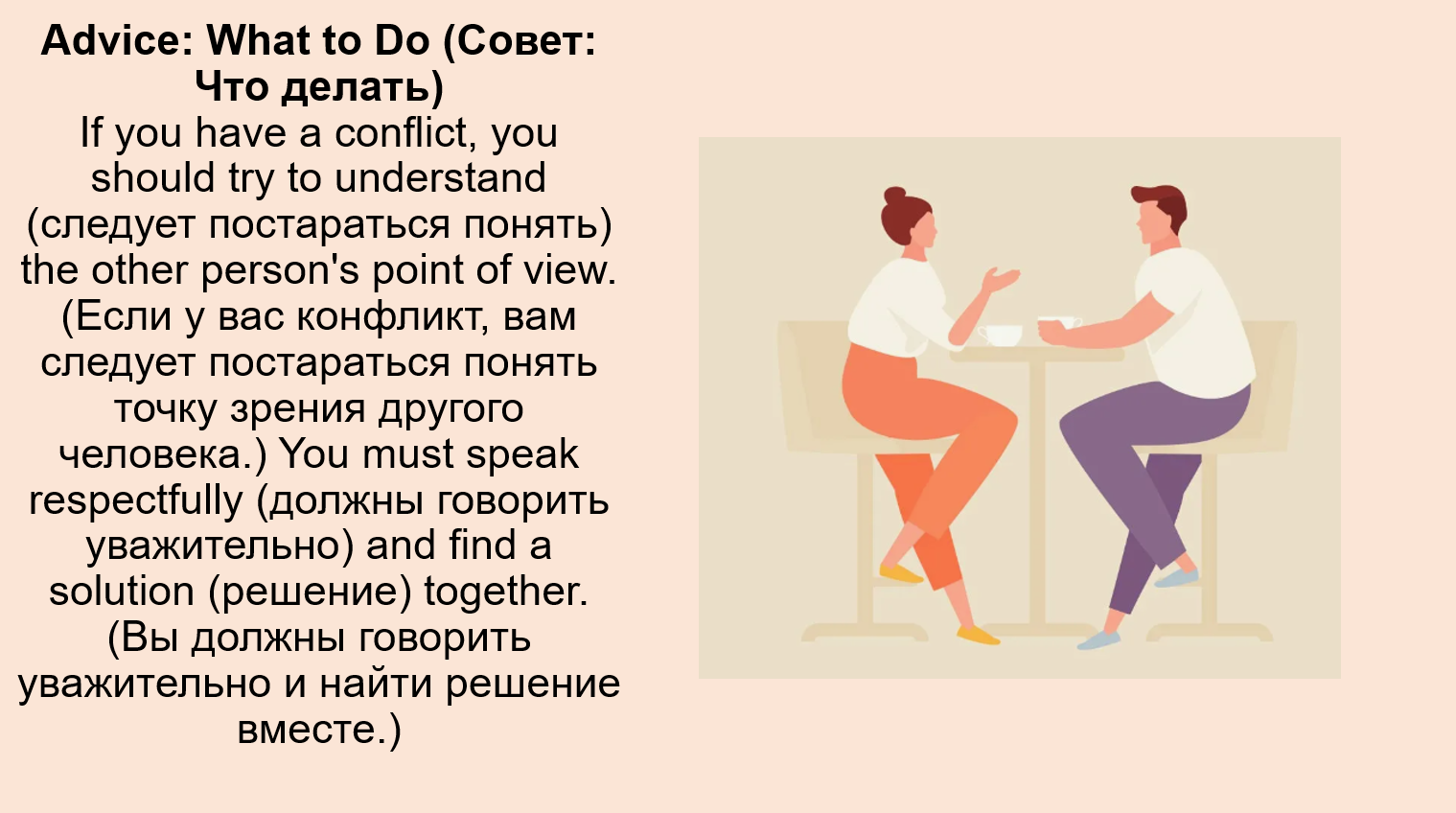 - Agree. (Согласен.) This is the basis of peaceful conflict resolution (мирного разрешения конфликтов): we must respect the right of others to disagree (не соглашаться), even when defending our own values (ценности).
