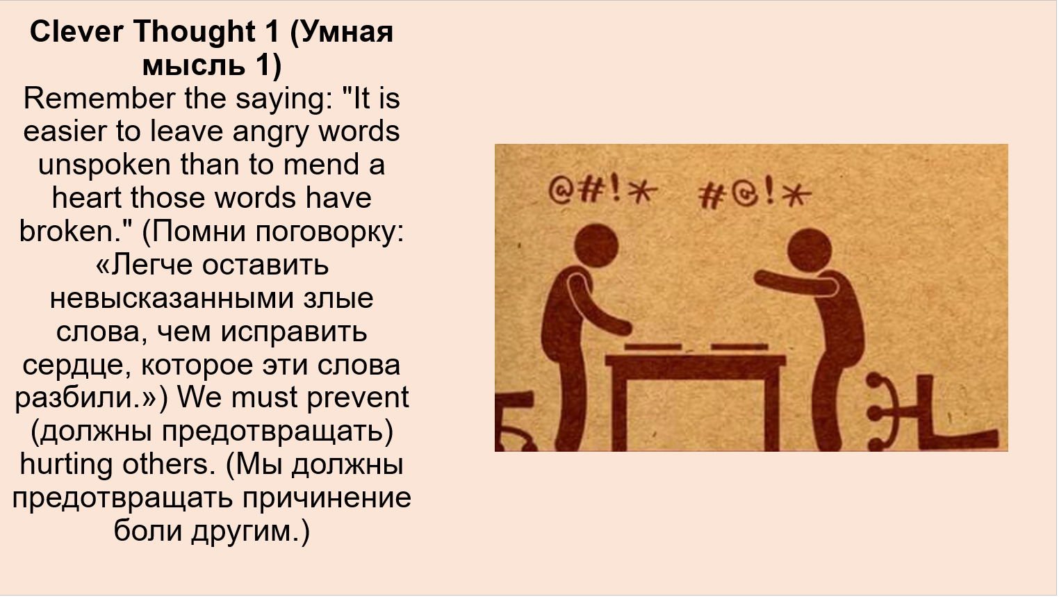 1. It is easier to leave angry words unspoken than to mend a heart those words have broken. (Легче оставить невысказанными злые слова, чем исправить сердце, которое эти слова разбили.)