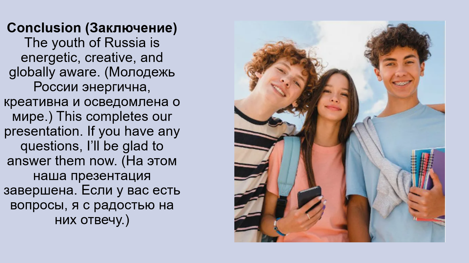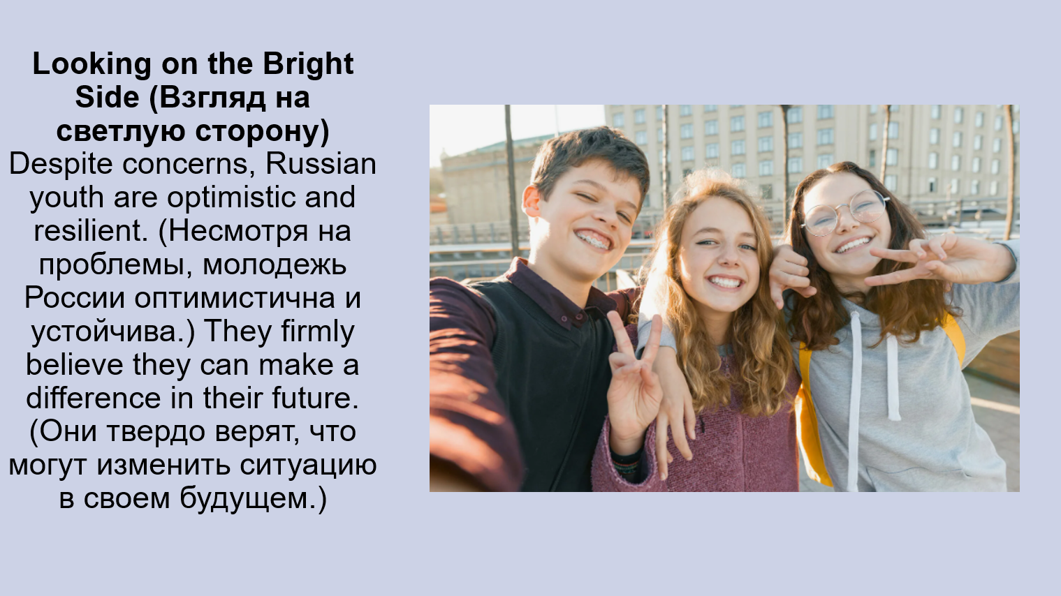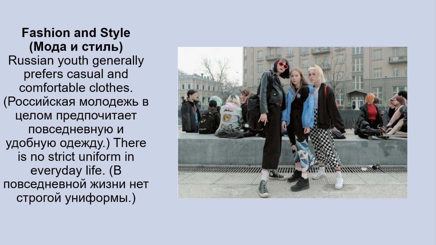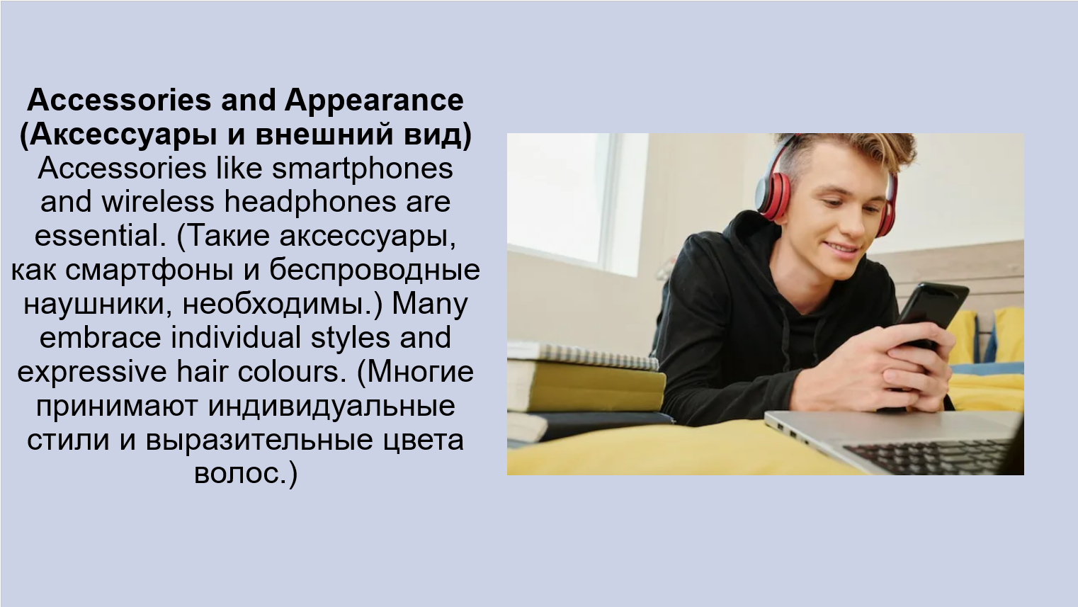 1. Clothes, accessories, hairstyles: Young people in Russia wear casual clothes (повседневную одежду), often following global trends (следуя мировым тенденциям). (Молодежь в России носит повседневную одежду, часто следуя мировым тенденциям.) They love accessories (любят аксессуары) like earphones (наушники) and smartwatches (умные часы).