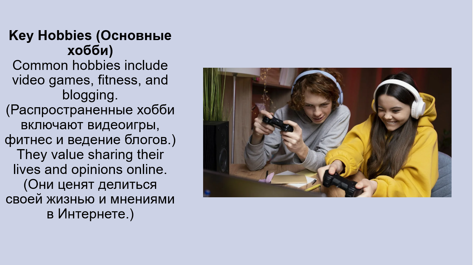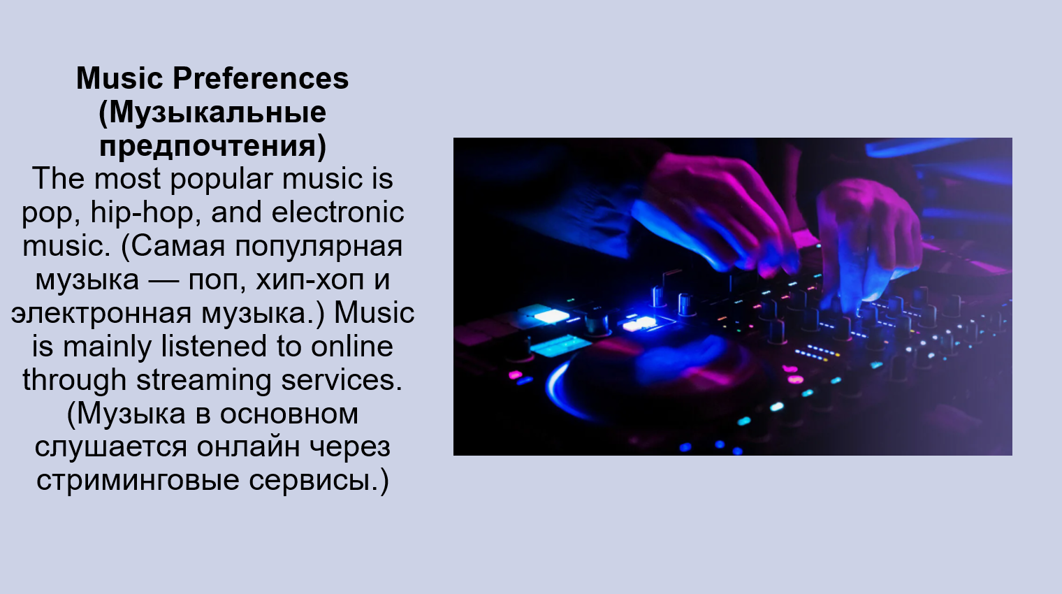 2. Music they enjoy: They enjoy pop, hip-hop, and electronic dance music (поп, хип-хоп и электронную танцевальную музыку), which is often listened to online (онлайн).