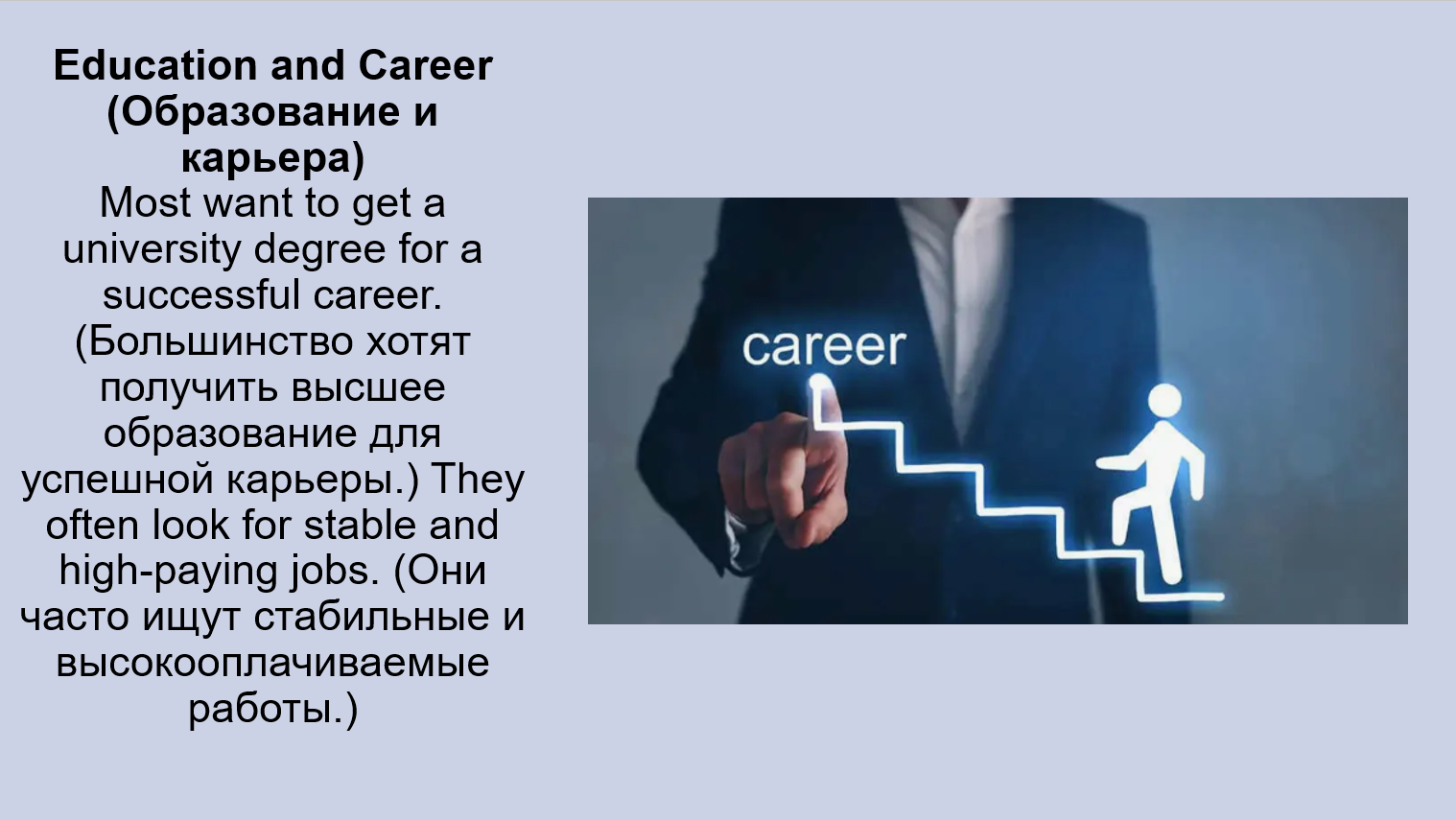 No, I don't dream of a career of a musician (не мечтаю о карьере музыканта) because I prefer a more stable job (более стабильную работу) like a lawyer. (Нет, я не мечтаю о карьере музыканта, потому что я предпочитаю более стабильную работу, такую как юрист.)