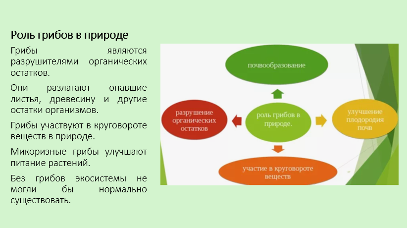 Добавить текст Озвучить Вернуть оригиналВ природе грибы играют важную роль, так как разлагают отмершие остатки растений и животных и участвуют в круговороте веществ. Многие грибы образуют микоризу с корнями растений и помогают им получать воду и минеральные вещества.