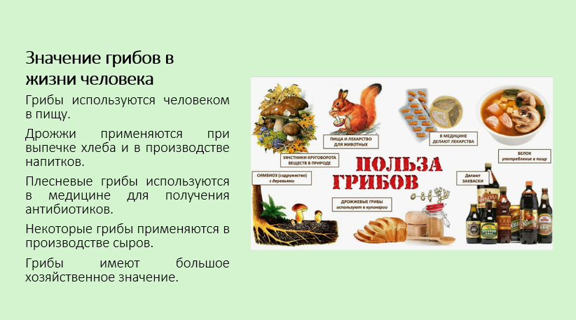 Добавить текст Озвучить Вернуть оригиналГрибы имеют большое значение в жизни человека. Их используют в пищу, в хлебопечении, медицине и производстве продуктов. Однако некоторые грибы опасны, так как являются ядовитыми или вызывают заболевания.