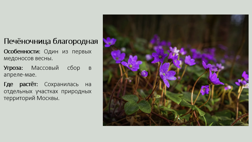Добавить текст Озвучить Вернуть оригиналОдним из самых красивых и редких растений Москвы является лилия кудреватая, или саранка. Это многолетнее растение с крупными розово-пурпурными цветками, лепестки которых закручены назад. Она встречается в старых лесопарках, например, в Битцевском лесу. Другое редкое растение — печёночница благородная. Это первоцвет, который зацветает сразу после схода снега. Из-за своей красоты она часто становится жертвой любителей весенних букетов, что приводит к её исчезновению в черте города.