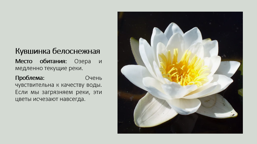 Добавить текст Озвучить Вернуть оригиналВ водоёмах Москвы, на территориях особо охраняемых природных зон, можно встретить кувшинку белоснежную. Это растение с крупными белыми цветами и плавающими листьями крайне чувствительно к чистоте воды. Если вода загрязняется, кувшинка погибает.