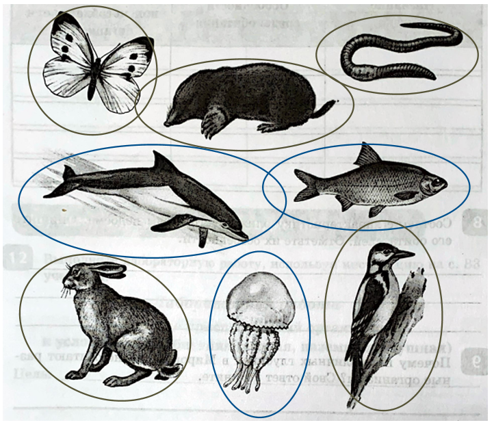 5. Рассмотрите рисунки. Распределите изображённых животных по их средам обитания, отметив обитателей водной среды синим карандашом, наземно-воздушной — коричневым карандашом.