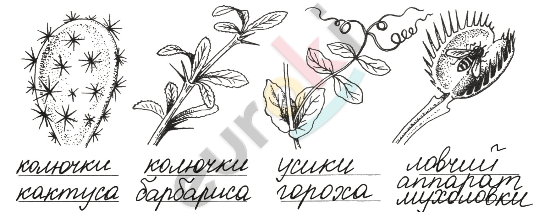 Видоизменения листьев у этих растений обусловлены их приспособленностью к окружающей среде, колючки кактуса необходимы ему, чтобы уменьшить испарение воды, усики гороху нужны для прикрепления стебля, а ловчий аппарат для хищного питания насекомыми, чтобы компенсировать недостаток азота.