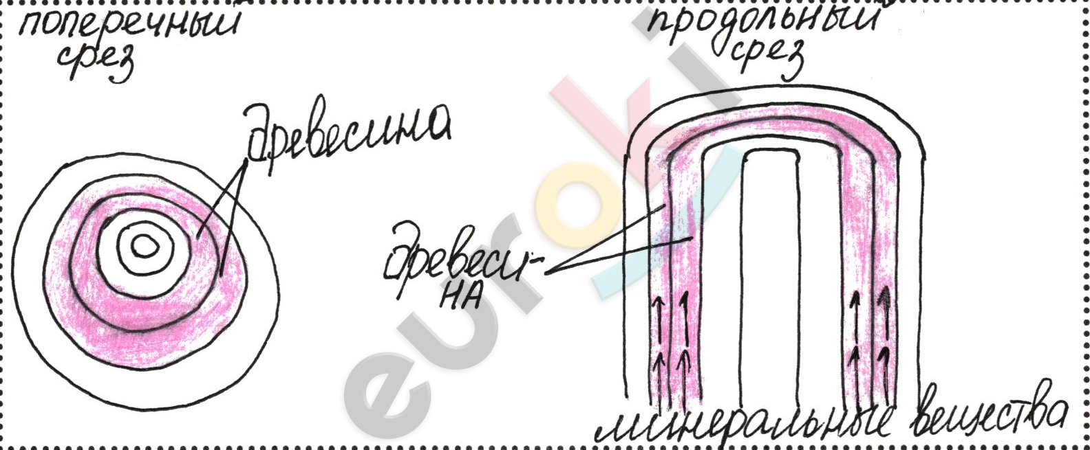 Вывод: Вода и минеральные соли поднимаются по сосудам древесины, мы можем сказать это, так как при помещения стебля в воду окрашивается только древесина.