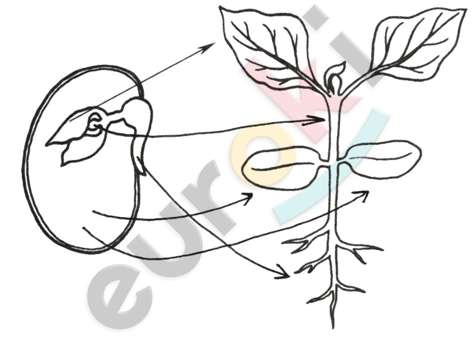 | Фасоль | Зародыш, семенная кожура | Зародыш, стебелек, почечка, корешок, семядоли | Семядоли |