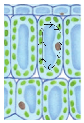 Движение цитоплазмы в клетке листа элодеи обычно имеет круговой характер.