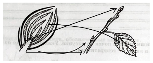 6. Рассмотрите рисунок. Сравните строение почки и побега. Соедините стрелками соответствующие части почки и побега.