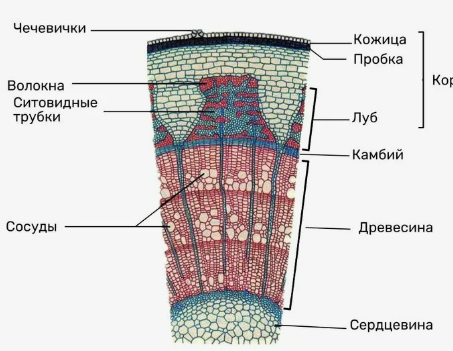 Внутренний слой коры называется лубом. Луб имеет критическое значение для жизни растения, так как по его ситовидным трубкам осуществляется транспорт растворов органических веществ от листьев ко всем остальным органам.