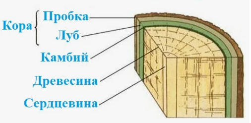 Пальцы ощущают влагу и некоторую скользкость — это содержимое разорванных клеток камбия, слой которого находится между корой и древесиной. Камбий является образовательной тканью, которая за счет деления клеток обеспечивает рост стебля в толщину.