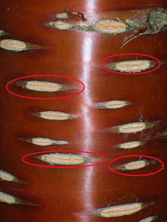 На ветвях разных растений чечевички имеют разную форму и размер, но всегда выглядят как небольшие возвышающиеся точки или штрихи на коре.