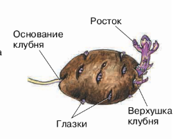 При внешнем осмотре клубня картофеля было обнаружено место его прикрепления к подземному побегу (столону) — это основание. Противоположная, более выпуклая часть клубня является его верхушкой.