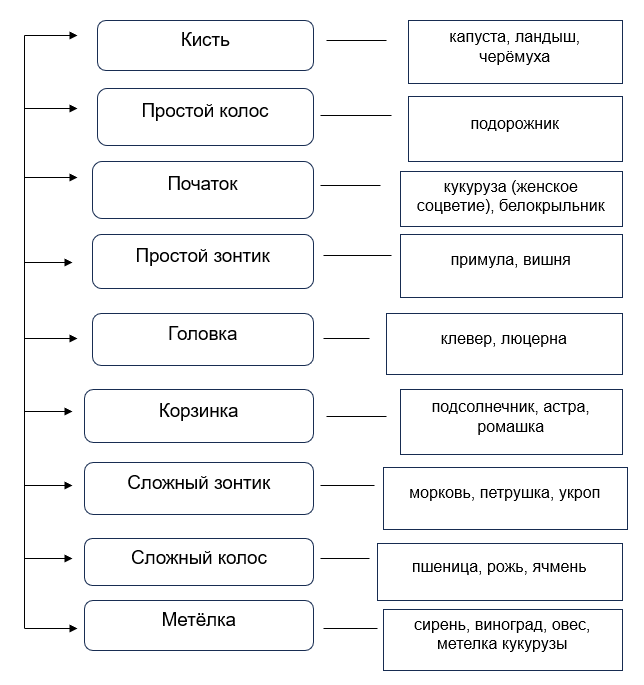 Вывод. В ходе лабораторной работы я изучил строение соцветий и убедился, что они представляют собой специализированные побеги, несущие группу цветков. Соцветия бывают простыми (цветки на главной оси) и сложными (на главной оси расположены простые соцветия). Главное биологическое значение соцветий заключается в том, что они делают мелкие цветки более заметными для насекомых-опылителей и повышают эффективность опыления ветром. Это приводит к образованию большего количества плодов и семян, что обеспечивает успешное размножение растений в природе.