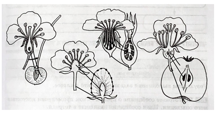 6. Изучив текст параграфа и рисунок 101, а также опираясь на имеющиеся у вас знания (вспомните строение плодов), укажите стрелками, из каких частей цветка образовались соответствующие части плода.