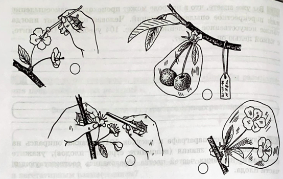 Рассмотрите рисунок. Художник перепутал последовательность действий селекционера при искусственном опылении. Обозначьте цифрами правильную последовательность действий и объясните (устно), с какой целью выполняется действие на каждом этапе искусственного опыления.