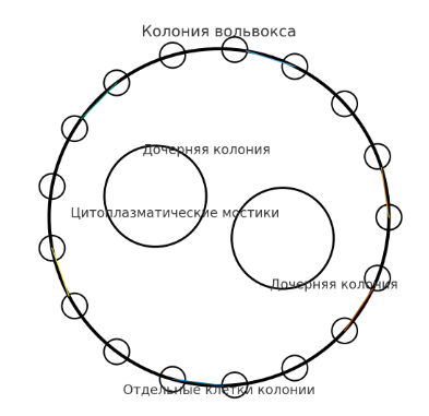 Добавить текст Вернуть оригинал5. Зарисуйте колонию вольвокса. Обозначьте на рисунке клетки колонии, цитоплазматические мостики, дочерние колонии.