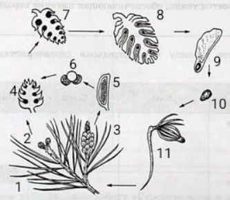 1) Рассмотрите рисунок «Жизненный цикл сосны», обозначьте (укажите) цифрами его составляющие.