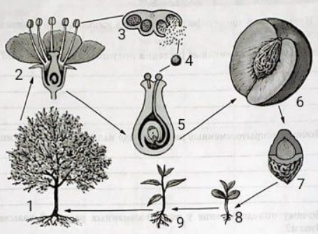 1) Рассмотрите рисунок «Жизненный цикл покрытосеменных», обозначьте (укажите) цифрами его составляющие.