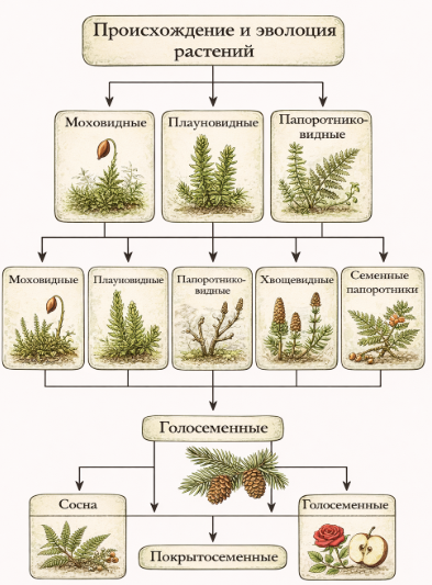 Добавить текст Озвучить Вернуть оригинал3. На основе имеющихся у вас знаний самостоятельно составьте схему «Происхождение и эволюция растений», используя названия основных групп растений: водоросли, моховидные, плауновидные, папоротниковидные, риниофиты, хвощевидные, голосеменные, семенные папоротники, покрытосеменные.