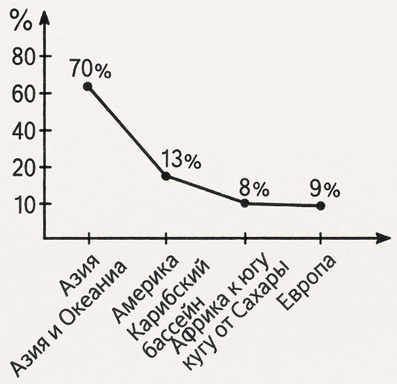 1. Представьте данные о распространении аскаридоза в мире графически в виде линейной диаграммы, позволяющей оценить соотношение величин.