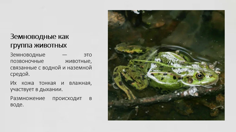 Добавить текст Озвучить Вернуть оригиналЗемноводные — это класс позвоночных животных, которые приспособлены к жизни как в водной, так и в наземной среде. Для размножения им обязательно требуется вода, так как развитие их икры и личинок происходит в водоёмах.