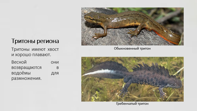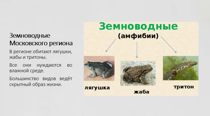 Добавить текст Озвучить Вернуть оригиналВ Московском регионе встречаются различные виды лягушек, жаб и тритонов. Наиболее распространены травяная лягушка, прудовая лягушка, остромордая лягушка, серая жаба, зелёная жаба, обыкновенный тритон и гребенчатый тритон.