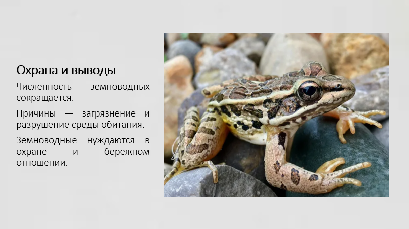 Добавить текст Озвучить Вернуть оригиналЗемноводные играют важную роль в природе, так как регулируют численность насекомых-вредителей и служат пищей для птиц, рыб и млекопитающих. Однако численность земноводных сокращается из-за загрязнения водоёмов, вырубки лесов и осушения болот. Поэтому многие виды нуждаются в охране.
