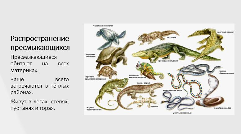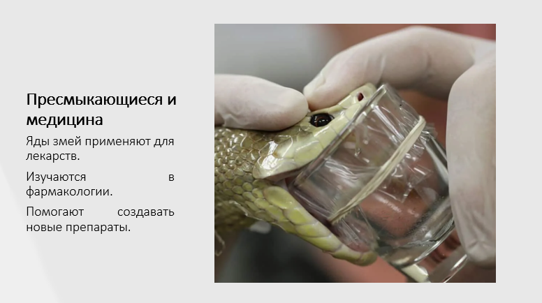 Добавить текст Озвучить Вернуть оригиналПресмыкающиеся имеют значение и для человека. Яды змей используются в медицине для изготовления лекарств. Некоторые виды содержатся в террариумах как домашние животные. Пресмыкающиеся также являются объектами научных исследований.