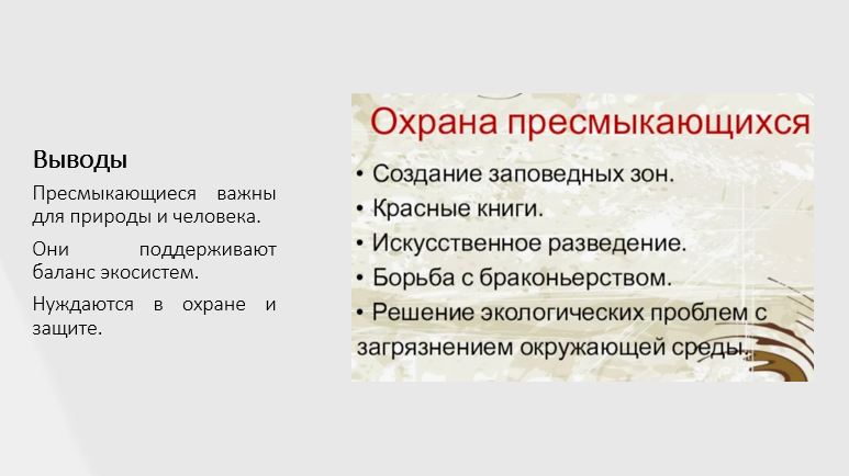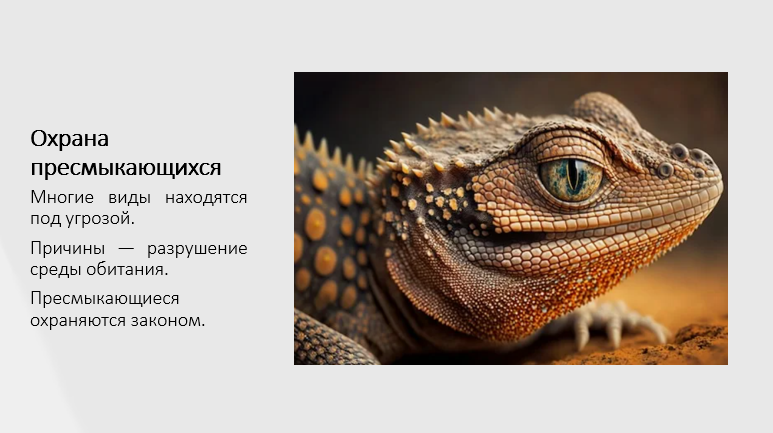 Добавить текст Озвучить Вернуть оригиналВ настоящее время численность многих видов пресмыкающихся сокращается из-за уничтожения мест обитания и загрязнения окружающей среды. Поэтому они нуждаются в охране и бережном отношении.