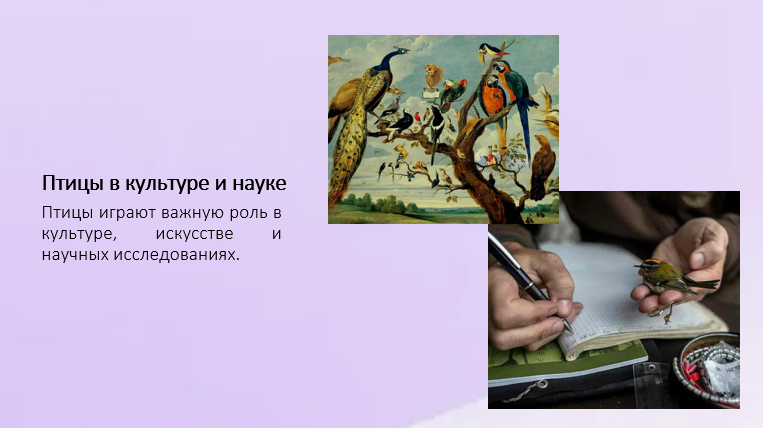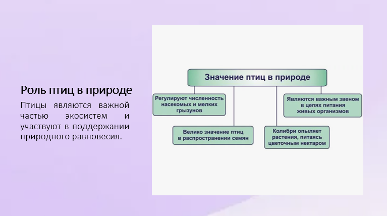 Добавить текст Озвучить Вернуть оригиналПтицы играют важную роль в природе и жизни человека. Они являются неотъемлемой частью природных экосистем и выполняют множество полезных функций.