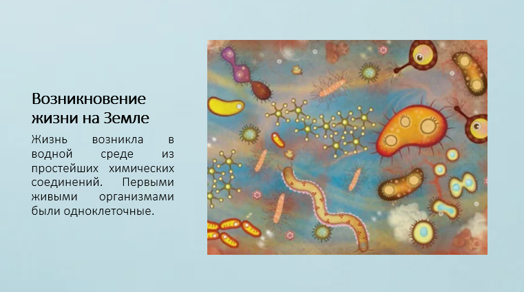 Добавить текст Озвучить Вернуть оригиналРазвитие живой природы на Земле происходило в течение миллиардов лет. Учёные считают, что жизнь возникла в водной среде из простейших химических соединений. Первыми живыми организмами были одноклеточные, способные существовать в условиях древней Земли.