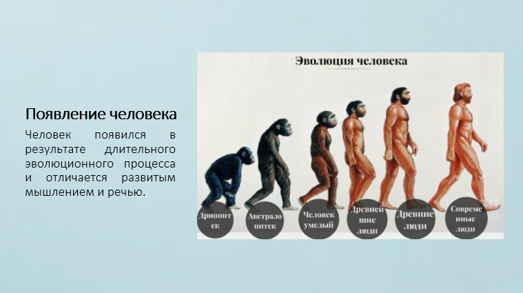 Добавить текст Озвучить Вернуть оригиналОдним из важнейших этапов развития живой природы стало появление человека, который обладает высокоразвитым мышлением и речью.