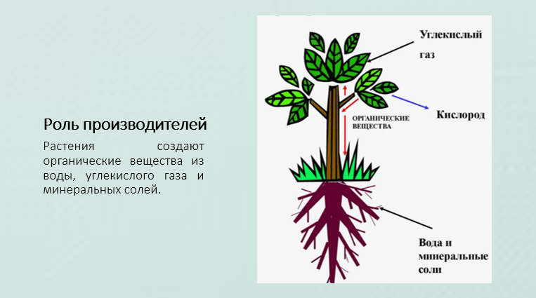 Добавить текст Озвучить Вернуть оригиналОснову круговорота веществ составляют растения — производители. Они создают органические вещества из неорганических, используя энергию Солнца. Эти вещества служат пищей для животных — потребителей.