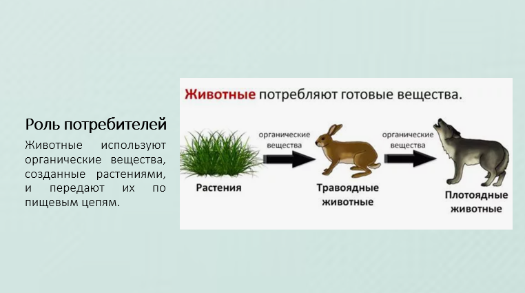 Добавить текст Озвучить Вернуть оригиналПотребители получают готовые органические вещества, поедая растения или других животных. В процессе жизнедеятельности они возвращают часть веществ в окружающую среду.