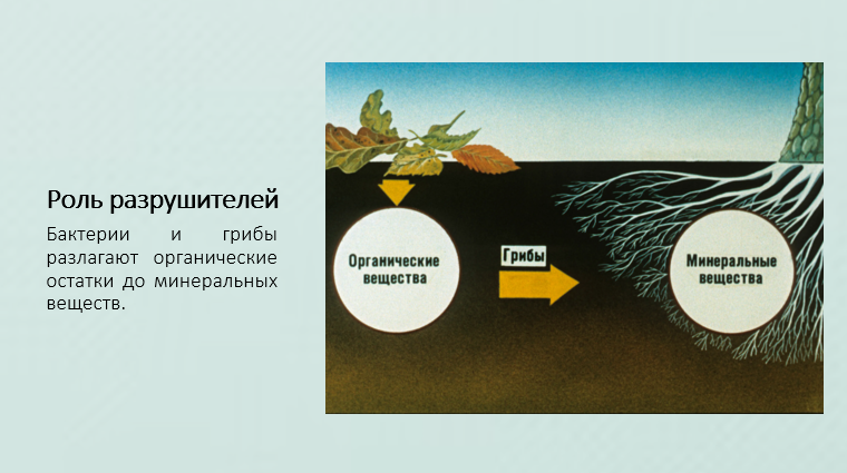 Добавить текст Озвучить Вернуть оригиналРазрушители, или редуценты, такие как бактерии и грибы, разлагают остатки растений и животных до минеральных веществ. Эти вещества снова становятся доступными для растений, и круговорот замыкается.