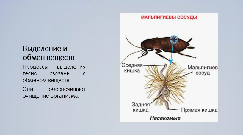 | Насекомые | С помощью мальпигиевых сосудов (трубочек, впадающих в кишечник). |