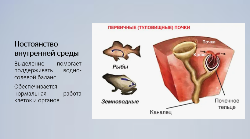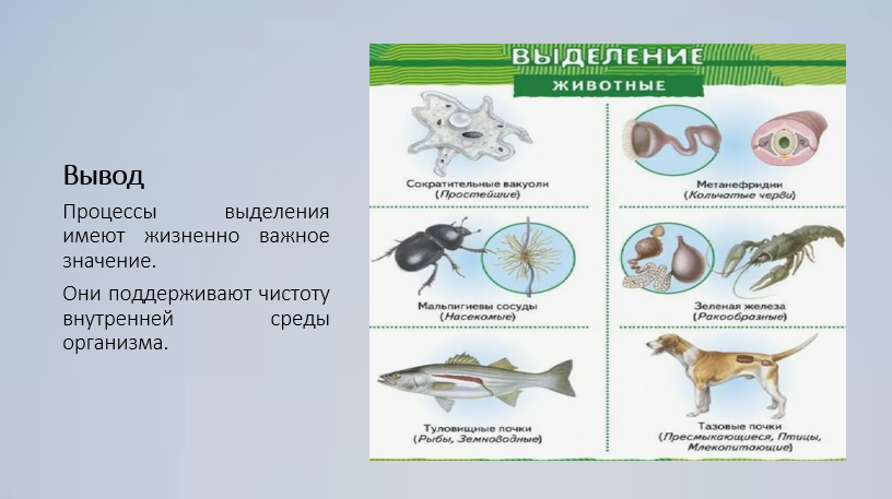 Добавить текст Озвучить Вернуть оригиналПроцессы выделения играют важную роль в жизнедеятельности животных. Выделение — это удаление из организма конечных продуктов обмена веществ, излишков воды и солей, а также вредных и токсичных веществ.