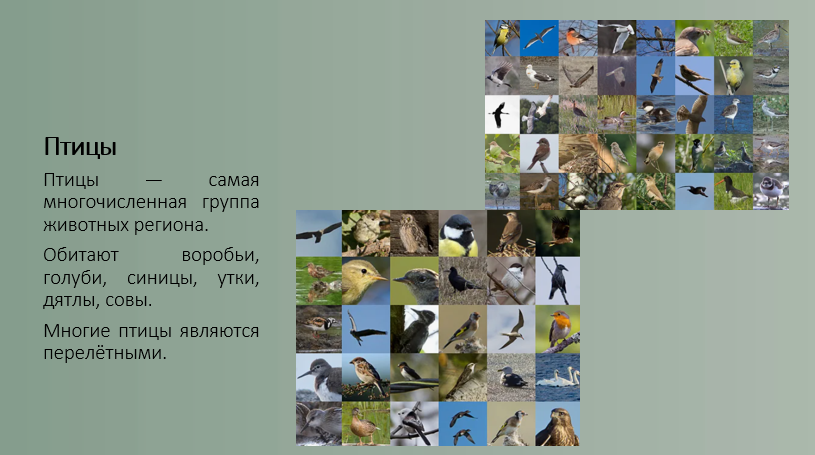 Добавить текст Озвучить Вернуть оригиналПтичий мир региона особенно богат. Здесь обитают воробьи, голуби, синицы, вороны, сороки, дятлы, совы, утки и лебеди. Весной и осенью через регион пролетают перелётные птицы.
