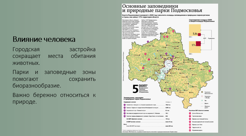 Добавить текст Озвучить Вернуть оригиналТерритория Москвы и Подмосковья расположена в зоне смешанных и широколиственных лесов, что создаёт благоприятные условия для разнообразного животного мира. Несмотря на высокую степень урбанизации, в регионе обитает большое количество видов животных.
