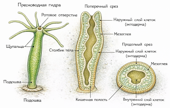 Сделайте выводы о размерах, форме, частях тела и внутреннем строении пресноводной гидры: Пресноводная гидра — небольшое кишечнополостное животное с вытянутым, мешковидным телом. На одном конце тела находится подошва, с помощью которой гидра прикрепляется к субстрату, на другом — ротовое отверстие, окружённое щупальцами. Внутри тела расположена кишечная (гастроваскулярная) полость, где происходит переваривание пищи. Стенка тела гидры образована двумя слоями клеток: наружным (эктодермой) и внутренним (энтодермой), между которыми находится тонкий слой (мезоглея). Такое строение подтверждает, что гидра — двуслойное животное, приспособленное к водной среде и хищному питанию.