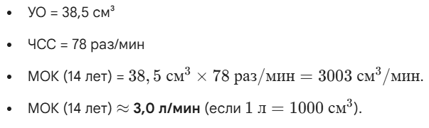 Величина минутного объёма крови у 14-летнего подростка составляет 3003 см³/мин, а у 15-летнего подростка — 3146,4 см³/мин.