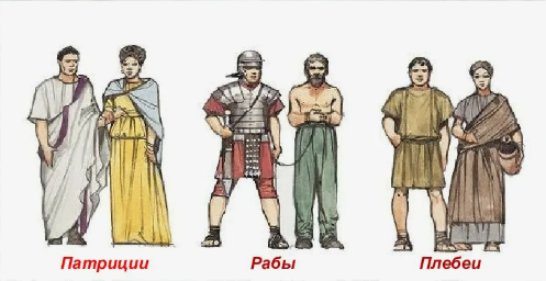 В Древнем Риме существовали такие категории населения, как патриции (знать), плебеи (простой народ), всадники (состоятельные граждане), нобили (новая знать из богатых плебеев и патрициев), рабы, вольноотпущенники и колоны (зависимые земледельцы).
