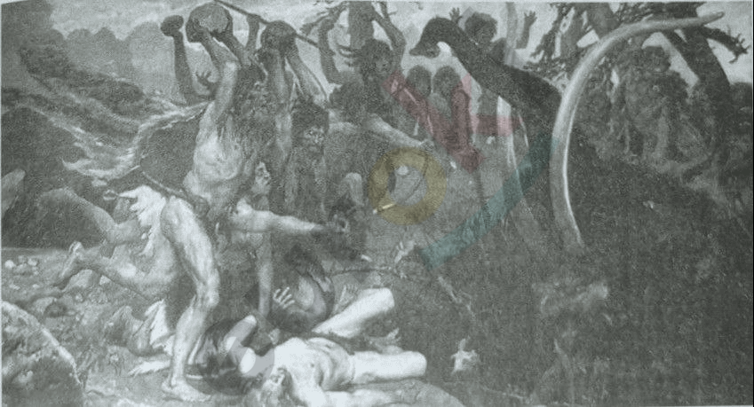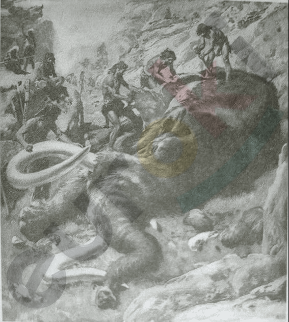 Добавить текст Вернуть оригинал2. Мамонт провалился в заранее подготовленную ловушку, из которой он вряд ли сможет выбраться. Благодаря этому окружающие зверя охотники смогут довольно быстро его убить. Охота была опасным занятием. На рисунке видно, как один из охотников тяжело ранен, и ему помогает его соплеменник. Несмотря на опасность, которую таила в себе охота на мамонта, заниматься ей было выгодно, так как убитый мамонт сполна обеспечивал древнейших людей мясом, шкурой и костями.