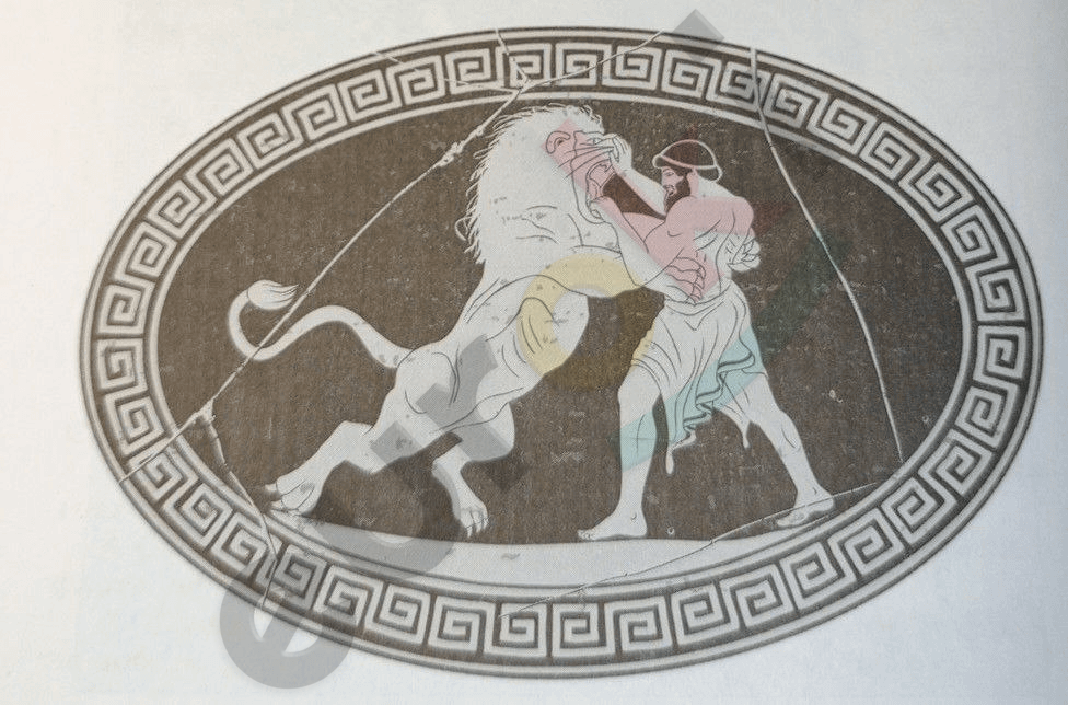 Героя звали Геракл. Художник изобразил сражение Геракла с немейским львом. Это был лев чудовищной величины с невероятно твёрдой шкурой, отчего её не брало ни одно оружие. По этой причине Гераклу пришлось сначала оглушить грозного зверя, а затем задушить голыми руками.